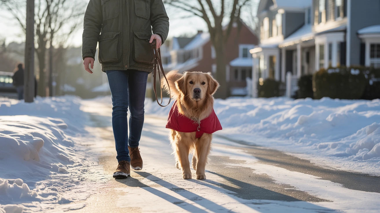 Proper winter protection like coats and booties helps dogs stay comfortable and safe during cold weather walks.